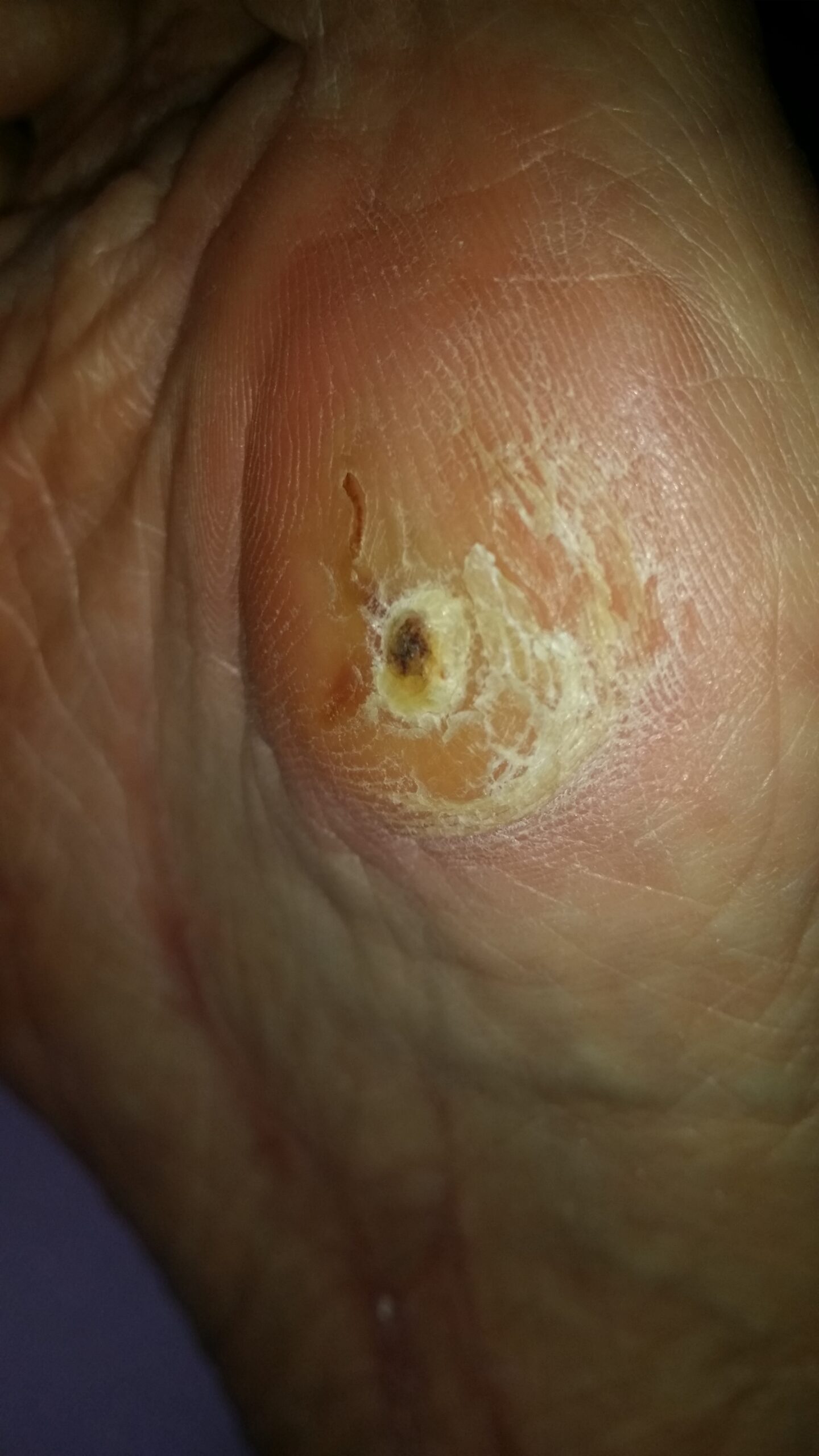 Intractable plantar keratosis or IPK’s are usually much more painful calluses though similar in superficial appearance. Intractable plantar keratosis are caused by pressure and shear force rather than shear force alone. IPK’s have a deep core present which becomes visible when they are debrided (trimmed). The core usually communicates with a sharp bony projection or focalized pressure area. The bony projections can be caused by arthritis, lack of a fat pad on the foot, or a fracture that did not heel properly. These types of skin lesions are extremely painful to walk on, patients commonly say it feels like there’s a pebble in their shoe.